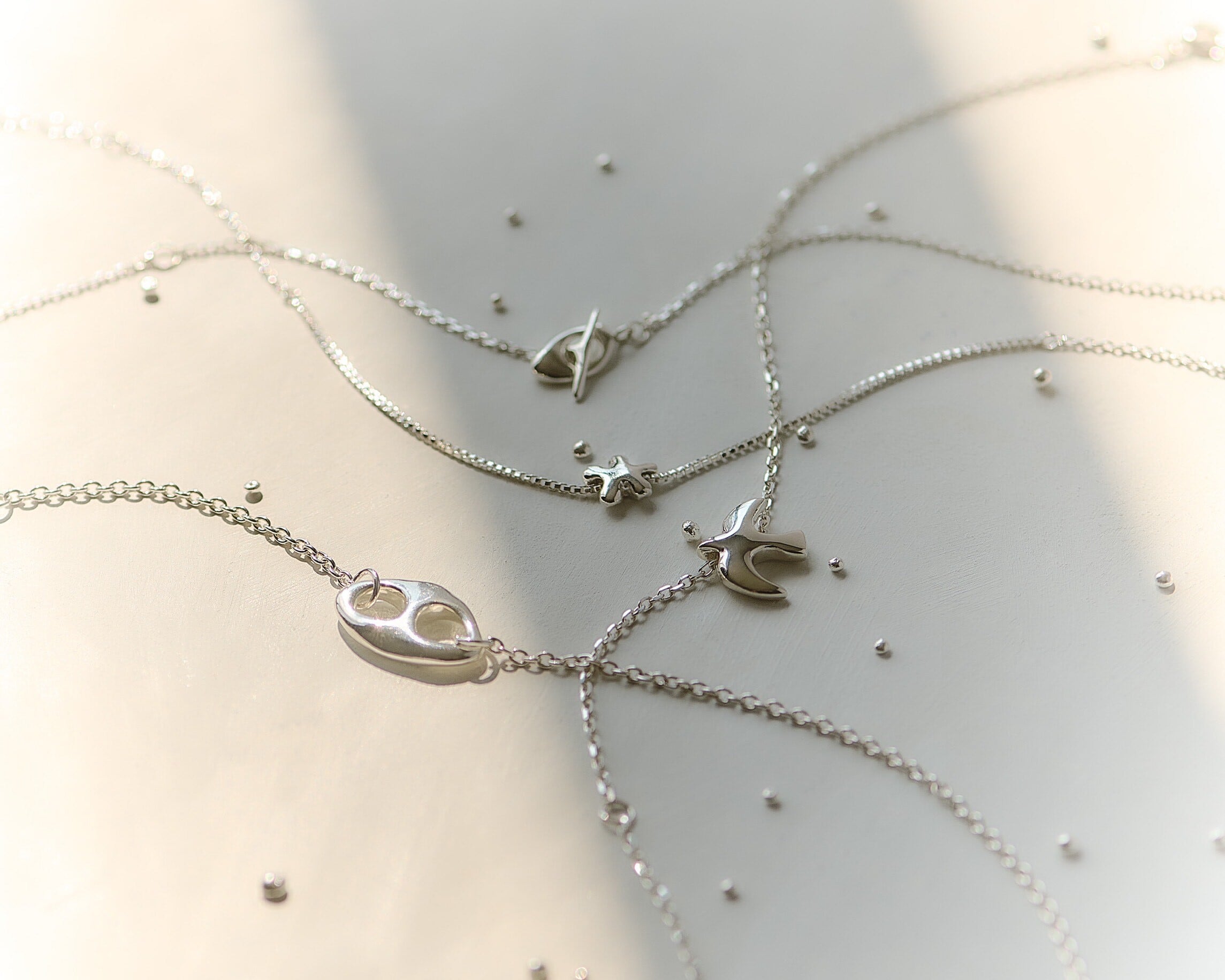 貝のフォルムからインスピレーションを受けデザインされたコレクション。貝モチーフは『厄除け』や『豊かさを育む』という意味もあります。途中の丸カンで留めるとブレスレットとしても着用できる2WAYタイプ。