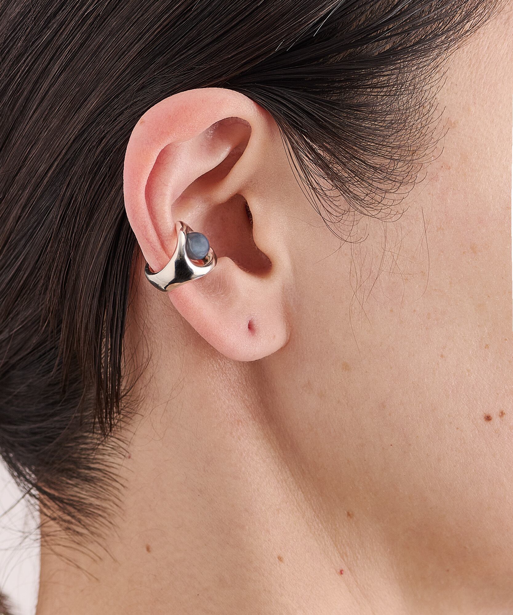 自然がつくるやわらかな曲線を生かし、有機的な丸みのあるデザインのイヤーカフにリサイクルガラスのビーズを付けることで、より印象的な存在に。